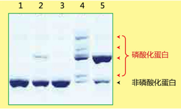 Phos-tag? SDS-PAGE 操作簡單,只需在常規(guī) SDS-PAGE 膠中加入 Phos-tag? Acrylamide 和 Mn2+ 或者 Zn2+ 即可進行實驗。在電泳過程中,磷酸化蛋白的磷酸基團與 Phos-tag? 中的二價金屬離子相結(jié)合,降低其遷移速度,從而可區(qū)分磷酸化與非磷酸化蛋白。